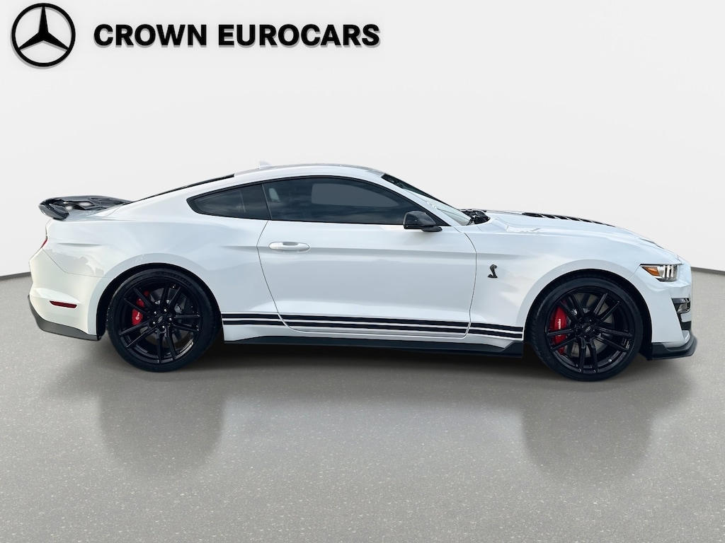 This 2021 Ford Shelby GT500 Coupe is finished in Oxford White over an Ebony leather-trimmed interior with gray accents and is powered by a supercharged 5.2L Predator V8 paired with a Tremec 7-speed dual-clutch transmission. Showing just 1,266 miles from new, this example is offered with a clean Carfax and presents in essentially as-delivered condition. Final assembly took place at Fords Flat Rock plant, and the car retains its original factory configuration, including optional exterior stripes, the Technology Package, and the factory gas guzzler tax as equipped.