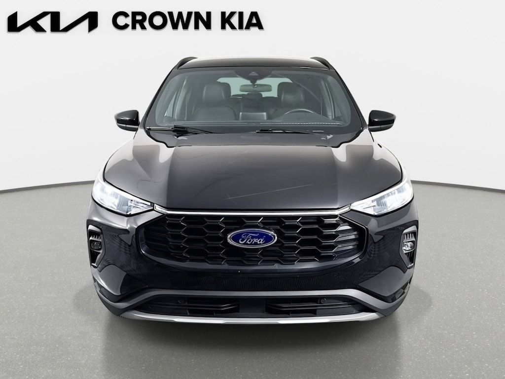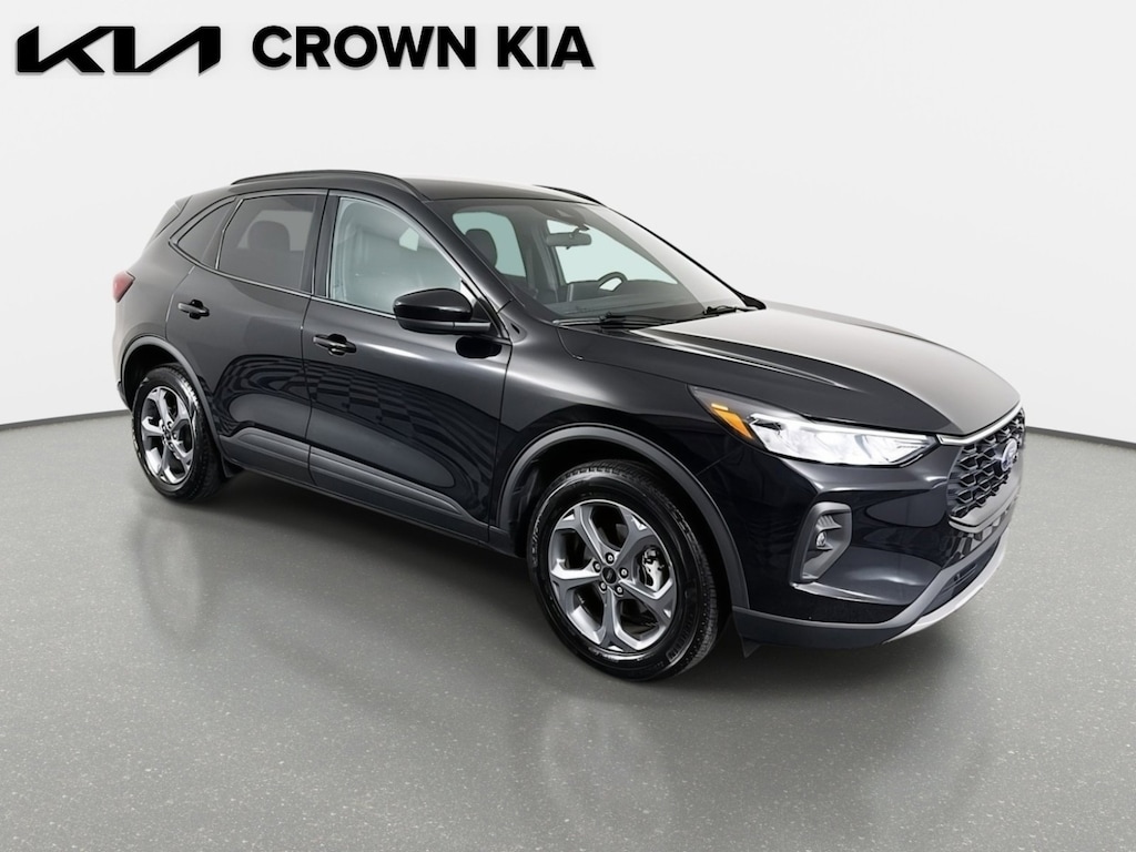 This 2025 Ford Escape ST-Line Select in Black features: AWD, 2.91 Axle Ratio, 4-Wheel Disc Brakes, 6 Speakers, ABS brakes, Air Conditioning, Alloy wheels, AM/FM radio: SiriusXM, AM/FM Stereo, Auto High-beam Headlights, Automatic temperature control, Brake assist, Bumpers: body-color, Compass, Delay-off headlights, Driver door bin, Driver vanity mirror, Dual front impact airbags, Dual front side impact airbags, Electronic Fuel Door Release, Electronic Stability Control, Emergency communication system: SYNC 4 911 Assist, FordPass Connect, Four wheel independent suspension, Front anti-roll bar, Front Bucket Seats, Front Center Armrest, Front dual zone A/C, Front fog lights, Front reading lights, Fully automatic headlights, Heated door mirrors, Heated front seats, Heated steering wheel, Heated Vinyl/Cloth Front Sport Contour Bucket Seats, Illuminated entry, Internet access capable: FordPass Connect 4G, Knee airbag, Low tire pressure warning, Neutral Towing Capability, Occupant sensing airbag, Outside temperature display, Overhead airbag, Overhead console, Panic alarm, Passenger door bin, Passenger vanity mirror, Pedestrian Alert Sounder, Power door mirrors, Power driver seat, Power Liftgate, Power steering, Power windows, Radio data system, Rear anti-roll bar, Rear reading lights, Rear seat center armrest, Rear window defroster, Rear window wiper, Remote keyless entry, Speed control, Speed-sensing steering, Speed-Sensitive Wipers, Split folding rear seat, Spoiler, Sport steering wheel, Steering wheel mounted audio controls, SYNC 4, Tachometer, Telescoping steering wheel, Tilt steering wheel, Traction control, Trip computer, Variably intermittent wipers, Wheels: 18" Rock Metallic Painted Aluminum, AWD. Clean CARFAX. 23/31 City/Highway MPG