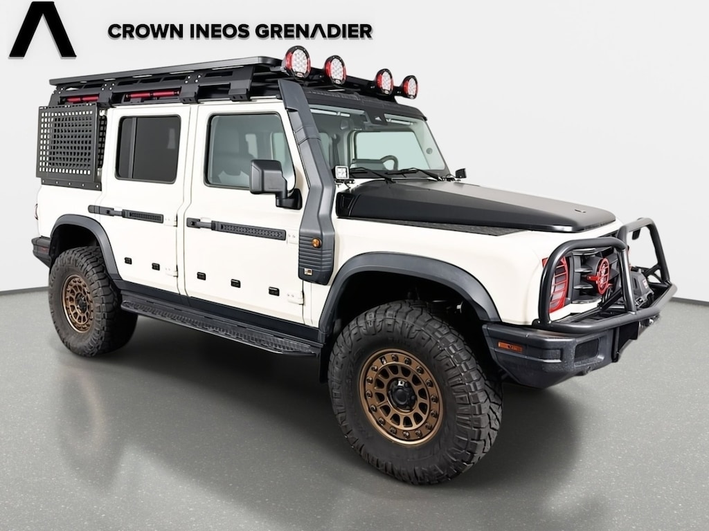 2024 INEOS Grenadier Base is for sale at Crown INEOS. It has an incredible amount of options. Aftermarket wheels, running boards, lights, red accents, red skid plates, interior upgrades, roof rack, canopy and more. Other features include - 18" Alloy Wheels, 4 Speakers, 4-Wheel Disc Brakes, ABS brakes, Air Conditioning, AM/FM radio, Anti-whiplash front head restraints, Auto High-beam Headlights, Automatic temperature control, Bodyside moldings, Bumpers: body-color, Driver door bin, Dual front impact airbags, Dual front side impact airbags, Electronic Stability Control, Exterior Parking Camera Rear, Front anti-roll bar, Front Bucket Seats, Front Center Armrest, Front reading lights, Heated door mirrors, Illuminated entry, Knee airbag, Leather Seat Trim, Leather steering wheel, Low tire pressure warning, Navigation System, Occupant sensing airbag, Outside temperature display, Overhead airbag, Overhead console, Panic alarm, Passenger door bin, Power door mirrors, Power steering, Power windows, Radio: Central Control System w/Navigation, Rear anti-roll bar, Rear fog lights, Rear window defroster, Rear window wiper, Remote keyless entry, Security system, Speed control, Speed-sensing steering, Split folding rear seat, Steering wheel mounted audio controls, Tachometer, TBD Axle Ratio, Telescoping steering wheel, Tilt steering wheel, Traction control, Trip computer, Variably intermittent wipers.