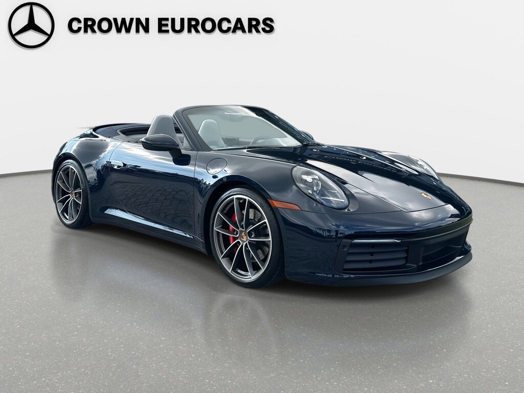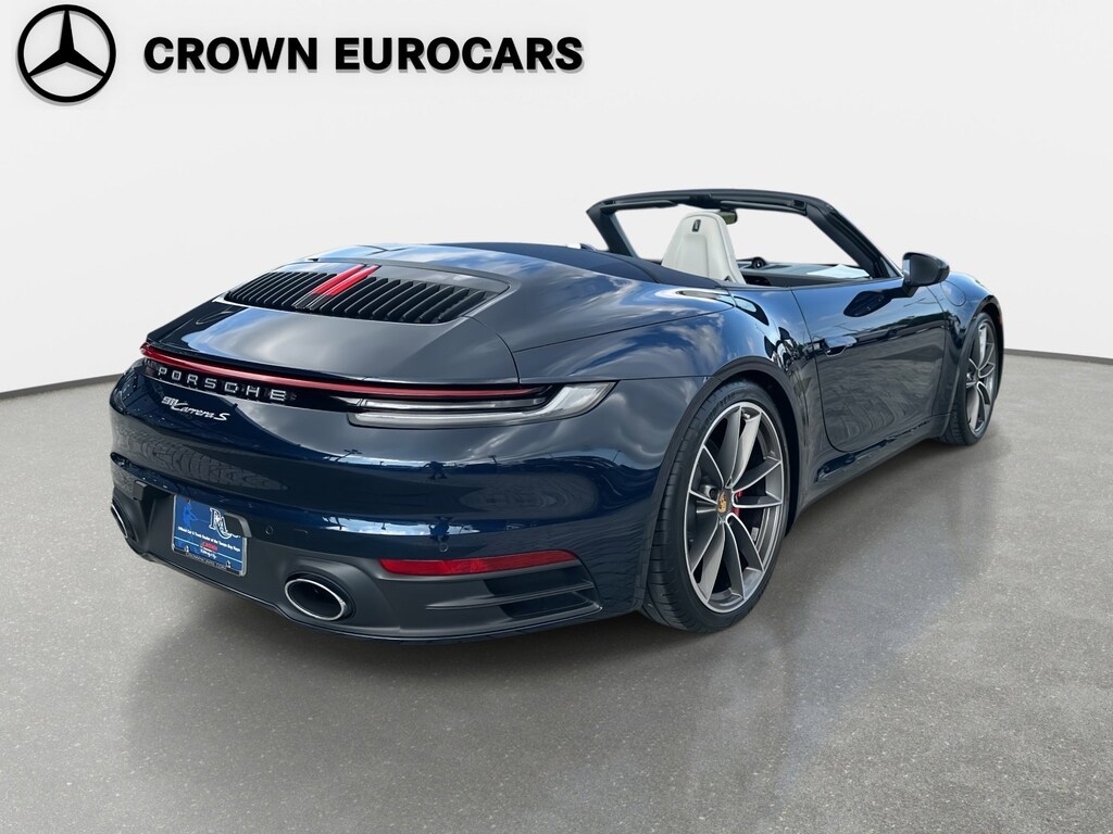 This 2020 Porsche 911 Carrera S Cabriolet shows only 24,646 miles and carries an original MSRP of $144,370, finished in Night Blue Metallic over Slate Gray/Chalk leather with a blue power cabriolet top. Power comes from a twin-turbocharged 3.0L flat-six paired with an 8-speed PDK automatic, delivering classic 992 performance with open-top usability and a well-selected factory build focused on comfort and driver engagement.