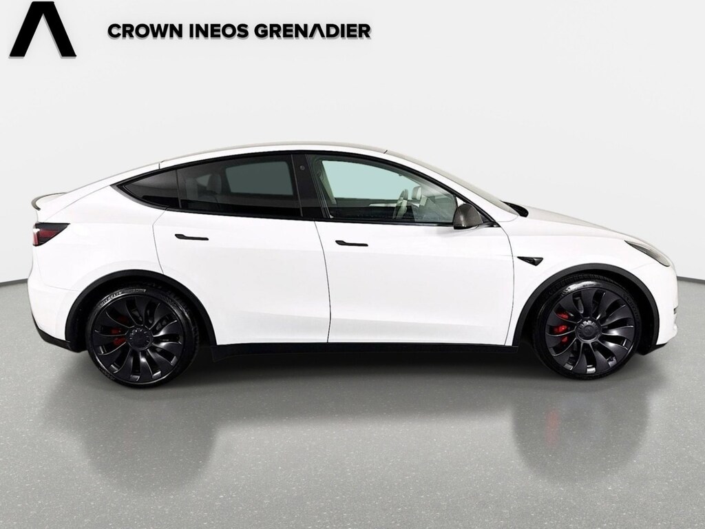 2023 Tesla Model Y Performance Pearl White Multi-Coat with white interior is for sale at Crown INEOS! NEW TIRES!! FSD 14 Speakers, 4-Wheel Disc Brakes, 5 Seat Interior, 9.0 Axle Ratio, ABS brakes, Air Conditioning, Alloy wheels, Audio memory, Auto High-beam Headlights, Auto tilt-away steering wheel, Auto-dimming door mirrors, Auto-dimming Rear-View mirror, Automatic temperature control, Brake assist, Bumpers: body-color, Compass, Delay-off headlights, Driver door bin, Driver vanity mirror, Dual front impact airbags, Dual front side impact airbags, Electronic Stability Control, Emergency communication system, Exterior Parking Camera Rear, Four wheel independent suspension, Front anti-roll bar, Front Bucket Seats, Front Center Armrest, Front dual zone A/C, Front fog lights, Front reading lights, Fully automatic headlights, Genuine wood dashboard insert, Heated door mirrors, Heated front seats, Heated rear seats, Heated steering wheel, HVAC memory, Illuminated entry, Knee airbag, Lane Departure Warning System, Low tire pressure warning, Memory seat, Navigation System, Occupant sensing airbag, Outside temperature display, Overhead airbag, Passenger door bin, Passenger vanity mirror, Power door mirrors, Power driver seat, Power Liftgate, Power passenger seat, Power steering, Power windows, Premium Audio System, Radio data system, Rain sensing wipers, Rear reading lights, Rear seat center armrest, Rear window defroster, Security system, Speed control, Speed-sensing steering, Split folding rear seat, Spoiler, Steering wheel memory, Steering wheel mounted A/C controls, Steering wheel mounted audio controls, Telescoping steering wheel, Tilt steering wheel, Traction control, Trip computer, Variably intermittent wipers, Vegan Leather Seat Trim, Wheels: 21" x 9.5 Fr & 21" x 10.5 Rr Uberturbine.